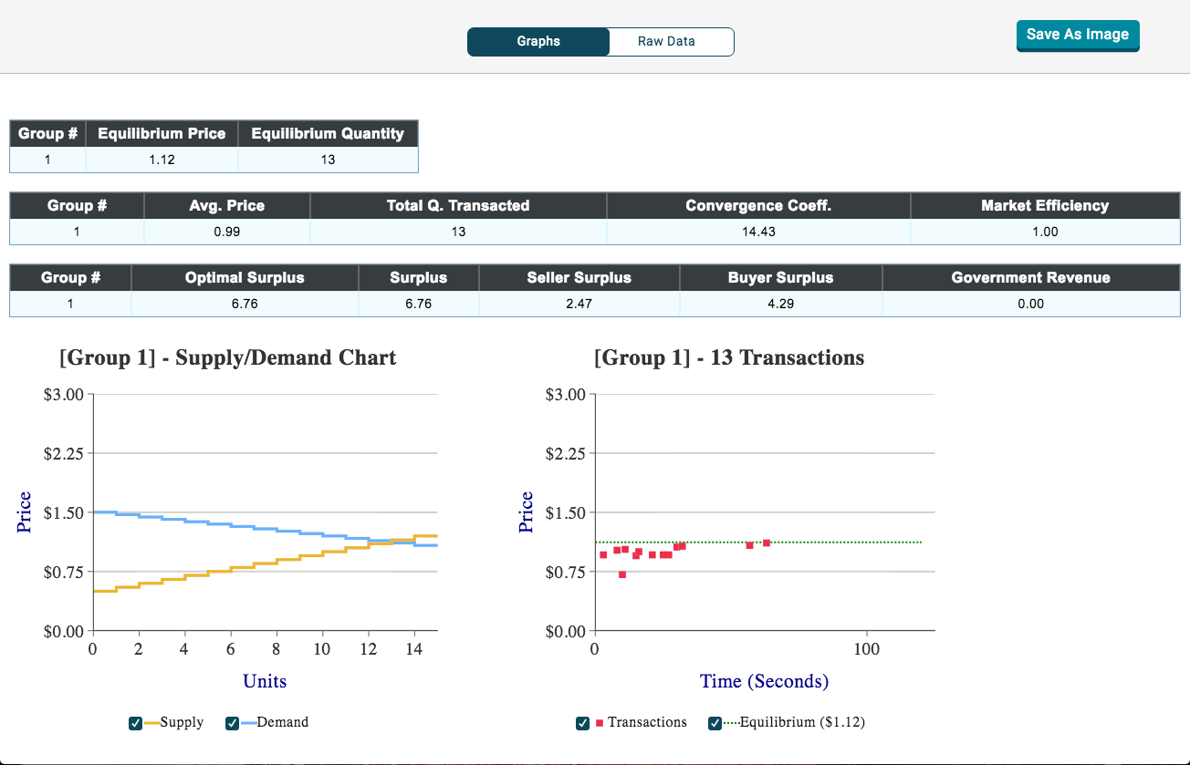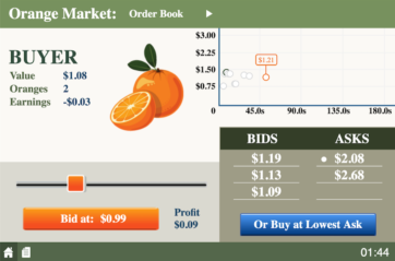 Our Competitive Market game is one of our most popular games in both Principles of Economics and Intermediate Microeconomics courses since it covers supply, demand, and market equilibrium. Students are divided into buyers and sellers and meet in a market based on the double auction for oranges. Through gameplay as self-interested buyers and sellers, students will discover the transaction of oranges converging at the market equilibrium price. Leading a discussion with the results is a great way to help students uncover the intuition behind their actions and reinforce this new concept.
